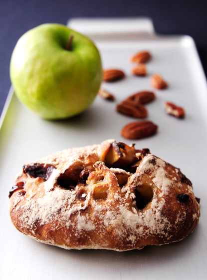 黄緑色が瑞々しく、小ぶりで愛らしい青リンゴ、"グラニースミス"。ヨーロッパ生まれのこの果実は、フレッシュで味わうその爽やかな酸味も美味ですが、火を加えることで引き出された濃厚な甘みがなんといっても絶妙です。そんなグラニースミスと、キャラメリゼしたピーカンナッツを、酸味の強いルヴァン生地で包み込みました。ゴロゴロとめいっぱい入った果実やナッツの食感も楽しく、噛むごとに豊かな味わいが広がります。日本ではまだ珍しいこの"グラニースミス"を、ようやくお届けできる喜びを込めた一品です。