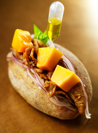 南アフリカで栽培され、健康茶として嗜まれるルイボスティ。その甘く香ばしい独特の香りから着想を得て、さわやかに楽しめる夏らしい味わいに仕上げたサンドが生まれました。自家製のゴマダレをよくからませた豚のマリネと、スライスした紫タマネギやスナップエンドウ、昆布だしのジュレを一緒にサンドし、トップにはゴロゴロと贅沢にカットしたみずみずしいアップルマンゴーをトッピング。生地は、歯ごたえのあるフランスパン生地を使用し、噛めば噛むほどに小麦の甘みが広がり、最後には、生地に練りこまれたルイボスティの香りがふわりと心地良く立ち上がります。がぶりとひと口ほおばれば、ごまの香ばしい香りをまとった旨みたっぷりの豚肉と甘くフレッシュなマンゴーがからみ合い、さらに紫タマネギなどの野菜のみずみずしくフレッシュな甘みが、咀嚼するごとに口の中で一つの味わいとして立体的にまとまっていく様には、感動すら覚えます。また、お好みでスポイトに入ったエクストラバージンオイルをかけるのがおすすめ。独特のツンとした辛味を持つオイルをスパイスのようにふりかけることで、全体的にキュッと味を引き締め、さらに食欲をかきたてます。あらゆる仕掛けを潜ませて仕上げた魅力たっぷりのジューシーサンドは、この夏にふさわしい充実の一品です。