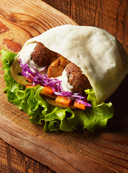 ひよこ豆のコロッケとフレッシュ野菜をスパイシーな刺激とともに味わう、イスラエル伝統のサンドイッチ「ファラフェルサンド」。この冬、パティシエール田中がその美味しさに心動かされ、エスコヤマ流にアレンジしたピタサンドが完成しました。ひよこ豆のコロッケ「ファラフェル」には、クミンにコリアンダー、パプリカ、チリパウダー、そしてフレッシュなイタリアンパセリを独自にブレンドしたスパイスを加え、華やかな香りとほんのり辛味を感じる味わいに。蒸し焼きにして旨味を閉じ込めた播州百日どりは甘辛い醤油ダレでソテーし、ファラフェルのテイストに寄せるよう、カレースパイスを少々まとわせました。周囲を色鮮やかに囲むのは、にんにくでソテーしたレンコンにレッドキャベツ、そして、エスコヤマの地元三田の藤原農園で、有機栽培、無農薬、無化学肥料で大切に育てられたリーフレタスとニンジンのソテー。味わうごとに、それぞれの野菜たちの自然な味わいが次々に顔をのぞかせます。さらにシェフ小山のアイデアで熟した柿をプラス。柿の甘味がより一層味に奥行きをもたらします。ソースは「ファラフェル」にかける伝統的なゴマベースの「タヒーニソース」を元にアレンジしたヨーグルトソース。ヨーグルトの酸味とゴマの甘味やコクが心地よくスパイスと絡みます。ピタパンのもちもちとした食感と相まって、飽きがこず、気づけばすぐに食べ終わってしまう一品です。