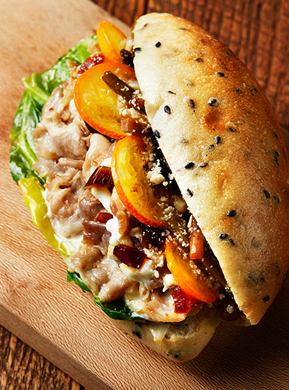 春キャベツに新玉ねぎ、若ごぼうなど、旬の恵みを上質な脂が魅力の三田ポークと贅沢に合わせました。ふわふわモチモチとした食感の白ゴマを練り込んだベーグル生地に黒ゴマを散らし、ごま特有の香ばしい味わいが存在感を発揮。ひと口頬張るとSORA農園さんから届いた春キャベツ、新玉ねぎの甘味と宮崎県産の金柑「完熟たまたま」のフルーティな酸味とほのかな苦味がいっそう素材の甘味を引きだします。香り高いごま油で作った、ねぎ塩だれで和えた三田ポークの旨味が噛むほどに広がり、醤油だれでソテーした若ごぼうのシャキシャキとした食感とやさしい苦味が全体を引き締めます。隠し味に忍ばせた京都の加茂茄子の味醂漬けの刻みとクリームチーズの旨味が一つ一つの素材を引き立たせまとめあげています。この時期にしか味わえない食材の調和をぜひご堪能ください。