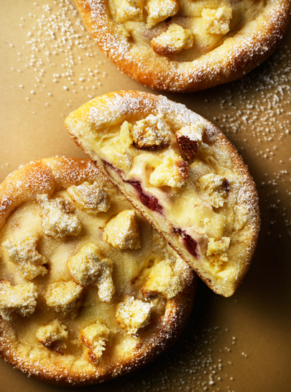 苺とクリームチーズが織り成す絶妙なハーモニーを、サクサクとした食感とともに味わうガレット。ふんわりやわらかなブリオッシュにバターたっぷりのしっとりきめ細やかな生地を重ね、ほんのり甘く漬け込んだ苺のマリネをのせて。その上に、クリームチーズを合わせた滑らかなカスタードクリームを絞りました。コクがありながらも爽やかなクリームの味わいは、甘酸っぱい苺と相性抜群。仕上げに一口サイズのスコーンを散らし、遊び心のある見た目を演出しました。サクサクとした歯触りを楽しみながら、広がるバターの香り、ジューシーな苺とクリームが相まって生まれる濃厚な味わいを一度に楽しめる、”パティシエが創ったパン”ならではの贅沢なコンビネーションをお楽しみください。