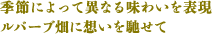 春から梅雨にかけて、大きな葉を広げてぐんぐん成長するルバーブは、収穫時期が後になるほど色味も味わいも濃く変化していきます。生まれたての可愛らしい少女のようなチャーミングな味わいから徐々に成長していく過程を感じていただくため、収穫したものが届いたらすぐに炊き上げ、そのときそのときの味わいを一気に閉じ込めています。
