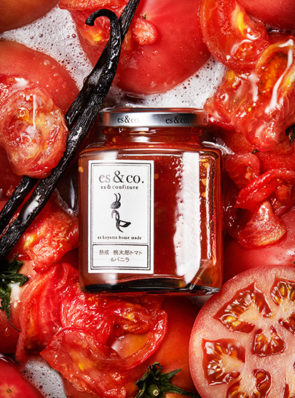 皆さんにとっても身近なトマトの品種である「桃太郎トマト」。「自然の力を借りれば、このトマトのポテンシャルをどれだけ引き出せて、どれだけ美味しくできるだろうか」とシェフ小山の実験欲に火が付き生み出されたのが、「熟成桃太郎トマト&バニラ」です。誕生のきっかけは、2つの製法との出会い。1つは、「家で実験をしまくっている」という小山流「酵素ジュース」。もう一方は、小山の知るバーテンダーやミクソロジストの多くがトマトのカクテルである「ブラッディーメアリー」を作るときにそれぞれ仕込んでいたという5日間熟成の自家製トマトピューレ。この2つの製法をかけ合わせれば、今までにないコクと甘味、旨味を持った桃太郎トマトのコンフィチュールができるのでは、と考えたのでした。酵素ジュースは、元からトマトが持つ酵素の力を利用。7~10日間、砂糖に果肉を漬け込んで旨味と甘味を引き出し、酸味をまろやかにしつつトマトらしさを際立たせました。熟成のピューレは、ミキサーにかけて状態を見つつ5~7日間冷蔵庫で寝かせることで、トマトの味が満遍なく行き渡りまとまりが出ます。それらを合わせ、最高品質のマダガスカル産バニラと共に炊き上げました。コクと深み、果肉が宿したまろやかな酸味がトマトらしさを感じさせ、バニラの甘い香りによって香りに複雑味が増し、ふっくらとした味わいに仕上がりました。