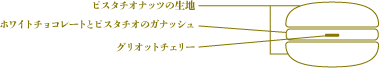 香ばしいピスタチオナッツが胸いっぱいに広がるマカロン。淡いグリーンの生地にも、ホワイトチョコレートベースのガナッシュにもローストしたピスタチオを練り込みました。キルシュに漬け込んだグリオットチェリーをアクセントに、ピスタチオ特有のナッティなコクを際立たせました。