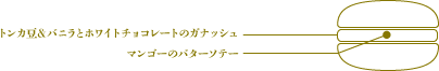 「マンゴーをソテーする」という、フルーツを料理の技法でアレンジすることで開ける新たな味わいを、マカロンに落とし込みました。ガナッシュはホワイトチョコレートをベースに、バニラをふんだんに加えて。さらに桜にも似た色気をはらんだ芳香を持つ、トンカ豆をプラス。そうして醸し出される「真夏の夜」を思わせるエネルギッシュな味わいのあとから、センターにしのばせたマンゴーソテーのジュレが、華々しい風味と甘酸っぱさをきりりと主張します。