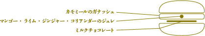 草花が豊かに咲く初夏の頃、ふとした瞬間にフワリと草花の香りがただよってくる…そんな季節のイメージをカモミールで表現しました。パートナーには、カモミールの風合いを生かしながらもフルーティーで華やかな甘みを主張するマンゴーをセレクト。ホワイトチョコレートにドライ・カモミールを閉じ込めたガナッシュ。センターのマンゴージュレにはライム、ジンジャー、コリアンダーという3つのスパイスを潜ませて。爽やかなライムの酸味と、ジンジャー、コリアンダーの微かなスパイシー感が、カモミール&マンゴーの甘くフローラルな味わいを立体的に際立たせてくれます。カモミールの花びらの白、花芯の黄色を見立てたバイカラーで、華やかな夏の訪れを一粒にこめました。