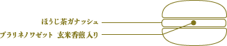 シェフ小山が生み出したICA(インターナショナル・チョコレート・アワーズ)2014の出品作品であるタブレットショコラ「玄米茶(ほうじ茶&玄米)」から着想を得たマカロン。特殊な製法で、一番緑茶を中心からまんべんなく焙じ、ほんのり甘さを感じる上品な香りと新鮮さの残る旨みを引き出した鹿児島産のほうじ茶をホワイトチョコレートのガナッシュに練り込んで、センターにはカリッとした食感と芳ばしさを宿した玄米香煎入りのプラリネノワゼットを忍ばせました。ほうじ茶の特長である“芳ばしさ”と“深い甘み”を最大限に表現した一品です。
