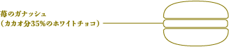 小さいお子様から大人の方まで幅広い世代から人気のあるフルーツ「苺」。こちらのマカロンはそんな苺の「シンプルな美味しさを味わっていただきたい」という想いで創り上げました。見た目も華やかなピンク色のマカロンコックにサンドしたのは苺のガナッシュ。カカオ分35%のホワイトチョコレートをベースに、特殊な技術で苺の甘酸っぱさを閉じ込めたチョコレートと酸味と香りが特徴的なセンガセンガナ種の苺を合わせ、甘酸っぱいチャーミングな苺の味わいを表現しました。しっとり、ほろりとした食感のマカロンコックに使われるアーモンドは、苺と同じバラ科でとても相性がよく、マカロンコック、苺ガナッシュの甘味、酸味、香りがバランス良く交わり、心地よい余韻を感じさせます。