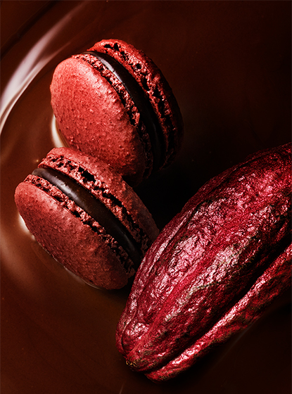 カカオはさまざまな姿で味わってこそ、そのポテンシャルを理解することができます。このマカロンも一見1層に見えますが、乳を使うガナッシュと、水とカカオフルーツのピューレから作ったガナッシュ、2つの手法で表現。ひと口齧ると、マダガスカル産カカオのフルーティな香りと程よい苦味・酸味が立体的に広がり、驚くほどの奥行きを見せます。チョコレート屋さんを持つエスコヤマならではの専門性が宿しながらも、マカロン屋さんらしく、皆さまに親しまれる味わいに仕上がりました。