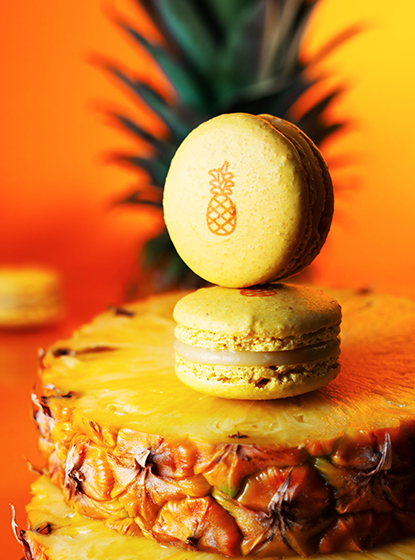 黄金色に輝く果肉は噛むほどに果汁があふれてジューシー。トロピカルな甘みと酸味、爽やかな香りが特徴の「ゴールデンパイン」をリアルに表現しました。自家製クーベルチュールを使ったガナッシュのセンターには、パイナップルとバニラのパート・ド・フリュイを。食べ進めるとバニラの甘く上品な香りが漂い、さらに濃厚なダークラムがパイナップルの輪郭を描くようにトロピカルな味わいを引き立てます。