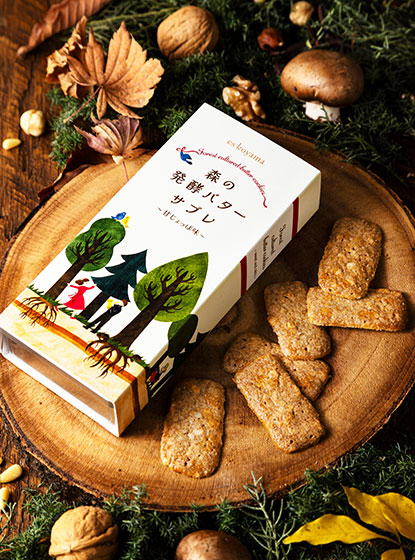 季節ごとに表情を変える自然の中で、木陰に腰をかけて読書にふける人、サックスの練習をする人、その音色に合わせて軽やかなステップを刻む人。犬と散歩を楽しむ人の足元には木の実やきのこがひっそり顔を覗かせ、地中深くには香り豊かなトリュフが眠っています。 リスは元気に駆け回り、耳を澄ませば小鳥の歌声も聞こえてくる――そんな生き物と植物が共生する世界をイメージして、「森の発酵バターサブレ」を焼き上げました。