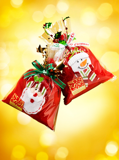 ざっくりとラフな編み目の真っ赤な布バッグに焼き菓子を詰めて。フロントにはふかふかのフェルトでサンタとスノーマンをデザインしました。プチサイズのギフトなので、あの人が欲しがっていたアイテムとセットで贈っても喜ばれそう。 [詰め合わせ内容] サブレ×3枚、焼き菓子×2個