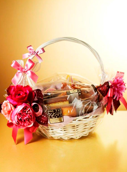 大きなサイズのバスケットにエスコヤマの焼き菓子を贅沢に詰め込んで。持ち手の両サイドにはガーベラやバラをデコレーション。花々と同じ、ピンクのリボンを添えて、煌びやかな表情に。日頃お世話になっている大切な方へ、感謝の気持ちを届けてくれる華やかなギフトです。 [詰め合わせ内容] サブレ×6枚、焼き菓子×7個
