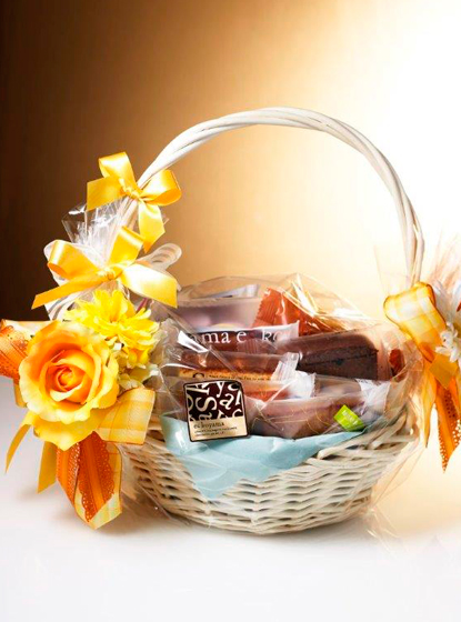 大きなサイズのバスケットにエスコヤマの焼き菓子を贅沢に詰め込んで。持ち手の両サイドにはガーベラやバラをデコレーション。花々と同じ、イエローのリボンを添えて、春らしく明るい表情に。日頃お世話になっている大切な方へ、感謝の気持ちを届けてくれる華やかなギフトです。 [詰め合わせ内容] サブレ×6枚、焼き菓子×7個