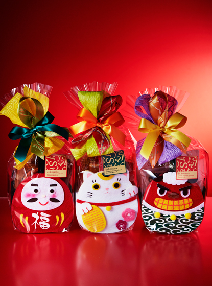 ファニーな表情を浮かべたキャラクターたちがかわいい、ミニバッグ型ギフト。だるま、まねき猫、獅子舞と、いずれもお正月にぴったりの縁起ものたちが、大切な方にハッピーをお届けします。取っ手を含め全てやわらかいフェルト素材でできているので、小さなお子様にお年玉代わりに贈るのもおすすめ。光沢のある素材や和紙をアレンジした、カラフルなリボン使いも新年らしさ満点です。