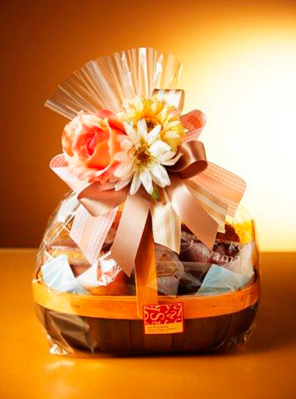 愛くるしいカラーのバラやガーベラに、エレガントなゴールドやピンクのリボンを合わせて。上品でやさしいテイストに仕上げたバスケット型のギフトです。ブーケのように華やかなギフトは、焼き菓子もたっぷり詰め合わせているので、お祝いやパーティなどにもおすすめです。