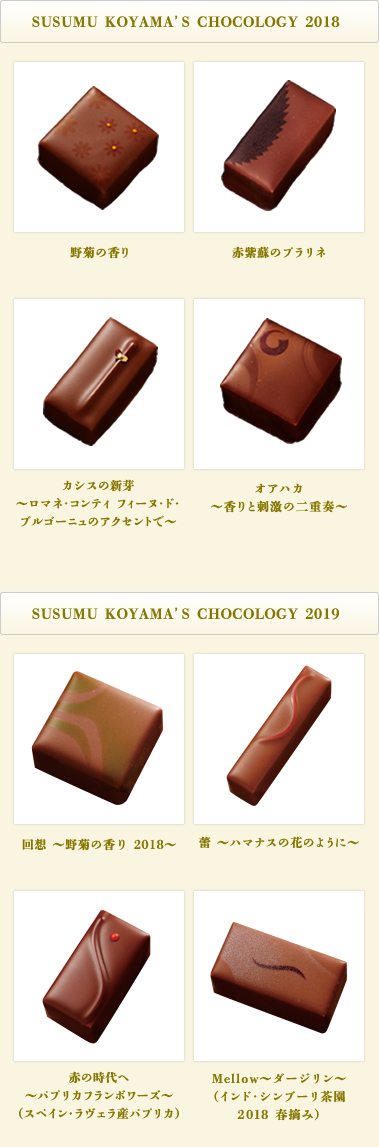 エスコヤマにある焼き菓子の多くは、オープン当初から続くものがほとんど。フィナンシェやクロッカン、カスティーユ、ガレットブルトンヌ……いずれもヨーロッパで生まれた伝統的な焼き菓子たち。それらに使用する主な材料は、卵、小麦粉、バター、砂糖、時にはナッツ類も含ませて。素材としては非常にシンプルながら、配合のバランスや生地の混ぜ方、焼き方によっては、全く異なる味わいや食感を醸し出します。そんな、ヨーロッパで古くから受け継がれてきた洋菓子を修業時代から学んできたシェフ小山は、伝統的なレシピをベースにしつつ、一番良いと思う素材を使って、日本の食文化の中で培われてきた自身の味覚が美味しいと感じる味を求めて革新を繰り返し、エスコヤマをオープンするまでの間にレシピを小山流にアレンジ。シェフ小山が感じ、培ってきた日本人としての感覚を活かし、表現したい味わい・食感・香りを求めて新たな配合を生み出しました。その配合をカタチにし、“より美味しいもの”を生み出すために、素材だけではなくお菓子を取り巻くオーブンなどの設備もカスタマイズ。「日本のモノづくり」が結集し、オリジナリティ溢れる「日本のお菓子」が確立していきました。日本のお菓子文化は、日本人の丁寧なモノづくりを背景にした菓子製造技術の発達の歴史でもあるのです。そうして生み出されてきたエスコヤマの焼き菓子もその流れを受け継ぎ、配合に合わせたオーダーメイドのオーブンを使って、今は若いスタッフたちによって毎日焼き上げられています。そんな焼き菓子たちと合わせてご賞味いただくのは、パリのコンクールに出品した8種類のボンボンショコラたち。伝統と革新によって生み出されるエスコヤマの定番の焼き菓子と日々進化するショコラを同時にお召し上がりいただけるアソートです。