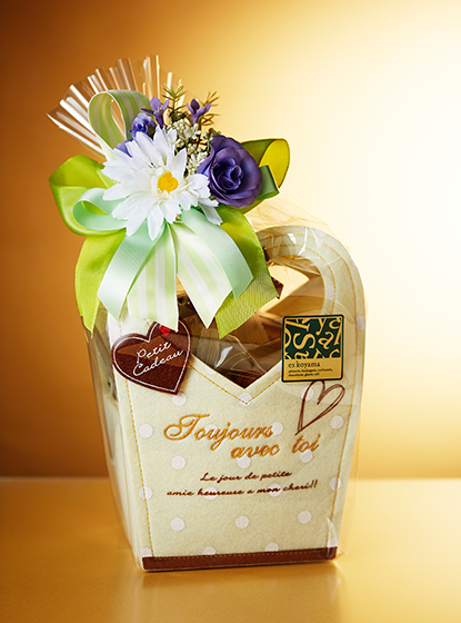 ハート型の大きな取っ手とさわやかな白いフォルムがとってもキュートなギフト。 鮮やかなグリーンのリボンや気品のあるブルーのバラ、白のガーベラを合わせて春の訪れを感じる装いに仕上げました。 “いつもきみと”というメッセージとともに、いつもの感謝を伝えてみてはいかがでしょうか。 [詰め合わせ内容] サブレ×3枚、焼き菓子×4個