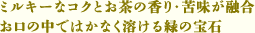 小山の名を冠した第3のスペシャリテ「小山チーズ」に、ショコラに続く新しい味のバリエーション「宇治抹茶」が加わりました。新緑の季節に視界に溢れる綺麗な緑色をした木々を見たシェフ小山は、「綺麗な緑色のお菓子を生み出したい」、「新茶の青々とした清々しい香りと色をお菓子で表現したい」という強い思いに駆られました。そしてこの度、温めていたアイデアを形にし、このアイテムを創り上げたのです。フランス産Kiri®クリームチーズと北海道産のクリームチーズの2種を使った、ミルキーでコクのある生地に、厳選した3種類の宇治抹茶をエスコヤマオリジナルの配合でブレンドし、香りが引き立つよう丁寧に丁寧にまんべんなく擦り合わせながら練り込みました。お茶本来のふくよかな香りが匂い立ち、ほのかな心地良い苦みがクリームチーズと融合し、穏やかに“和”を感じさせてくれるお菓子です。