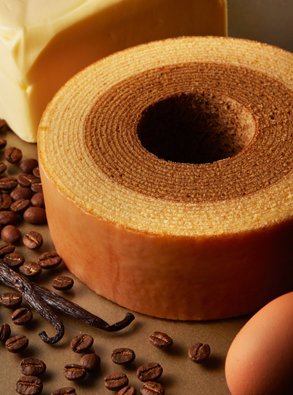 エスコヤマオープン14周年を記念し誕生した2つのバウムクーヘン「カフェオレ」と「スペシャルプレーン」が互いの良さを活かした2層タイプのバウムクーヘンとして新しく生まれ変わりました。シェフ小山が幼少の頃、夏休みを過ごした兵庫県多可町加美の豊かな自然の中で育った播州平飼い地鶏の有精卵のみを使用したコク深い小山流バウムクーヘンの味わいをベースに、内側の層は、コーヒー牛乳を思わせるどこか懐かしい香りと味わいの「カフェオレ」を。その味わいをやさしく包み込むのが外側に配した「スペシャルプレーン」の層。風味豊かな発酵バターがもたらすコクが、味わいに厚みと長い余韻をもたらし、心地良いマリアージュを生み出します。2層ならではの味わいの変化とそれぞれの個性を感じていただきながら、ゆっくりとお楽しみください。