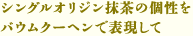 ワインをはじめ、スペシャルティコーヒーやシングルオリジンカカオなどが注目される中、エスコヤマでもそういった個性溢れる素材を使い、主にボンボンショコラなどでその味わいを表現してきましたが、ついに「抹茶」のシングルオリジンと出会い、その個性をバウムクーヘンで表現することが出来ました。 使用したのは、玉露として育てられることの多い「五香」という品種のお茶。 その名の通り香りが豊かで、お抹茶にするとクリーミーかつ甘味を感じられるという個性を持っています。 その五香を生地に丁寧に合わせ、焼成後も味わいがしっかりと宿るよう大切に焼き上げました。 周りのグラスにも五香を混ぜ込み、味わいとビジュアルの両面で抹茶を表現。 ふんわりしっとりとした小山流バウムクーヘンらしさはそのままに、お抹茶の特徴である香り、旨味、そして長い余韻をご堪能いただける逸品が完成しました。 お口を去った後も残る五香の風味にきっと驚かれることでしょう。