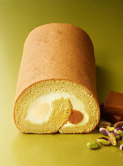 生命線である生地は朗らかなグリーンカラーに。卵黄、はちみつ、たっぷりのミルク、イタリア産の上質なピスタチオ、これらに丁寧に空気を抱き込ませながら腕を回し、生地が含んでいる水分を蒸発させながらじわじわと焼き上げることで、しっとり、ふわふわ、もっちりとした口当たりが生まれます。 その一面にひろげたのは生クリームをベースにしたピスタチオのムースリーヌ。そしてマダガスカル産バニラを使って炊き上げた自慢のクレームパティシエールと、コニャックでアクセントを付けたキャラメルガナッシュを絞り、ぐるっと捲きこんで。頬張ってみるとピスタチオ特有のナッティな香りが心地よくも、味わいはたしかに「小山ロール」。このプレーンから逸脱しないデリケートな加減でこそ、エスコヤマのスペシャリテとして唯一無二を裏付けることができるのです。 ちなみに小山ロールは“手”で、生地のふわふわを感じながらお召し上がりいただくのがおすすめ。フォークを使う場合も上から刺すようにして、ギュッと押しつぶしてしまわないようご注意くださいね。