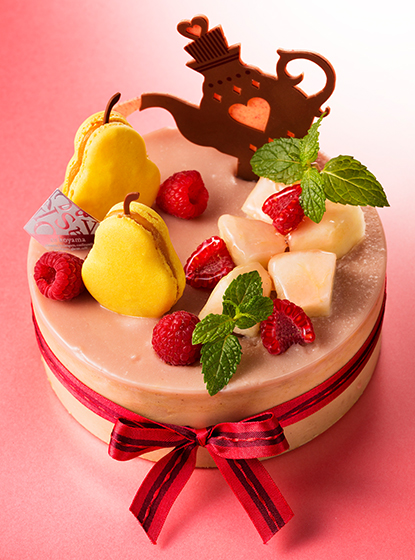 2018年の秋、世間を賑わしたビターでもミルクでもホワイトでもない“第4のチョコレート”といわれる、カカオ本来のフルーティな酸味を宿した「ルビーチョコレート」と、パティシエールの武村との出会いが生み出したのが、こちらのアントルメ。飾りにはハートをあしらい、ルビーの色を活かしたピンク色のグラサージュで仕上げられたビジュアルは、いかにも乙女チック。メインとなるのは、エスコヤマのカフェhanareの紅茶を仕入れさせて頂いている芦屋の紅茶専門店uf-fu(ウーフ)さんから仕入れた、フランス領レユニオン島産のブルボンバニラで香り付けしたインド産アッサムティーのほのかに甘い香りと味わいを移したムース。その味わいを引き締めるのが、センターに配した洋梨とフランボワーズのジュレの酸味。ジュレの中には、洋梨のコンポートとフランボワーズ・マセラシオンを散りばめて、舌にダイレクトに当たる果肉の味わいをアクセントに。ボトムのショートブレッドはザクザクとして食感にリズムと芳ばしい香りを演出します。さらに、ボトムの上にはルビーチョコのガナッシュをサンドして全体の味わいを底上げする名わき役に。飾りに配した洋梨の形をしたキャラメルポワールのマカロンはこのケーキのためだけに作られたオリジナル。シェフ小山のアドバイスで仕上げのグラサージュには酸味を効かせて、より立体感のある味わいへとブラッシュアップしました。洋梨とフランボワーズの華やかな香りと酸味、そしてブルボンバニラで香り付けされたバニラティーの全体を包み込むような甘く優しい香りが心地よいマリアージュを生み出します。