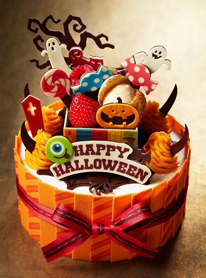 2020年にお届けするエスコヤマのハロウィンデコレーションは、サプライズボックスを開けたらお菓子が飛び出した! というイメージでオバケを模ったチョコと苺やプチシューたちを所狭しと盛り付けました。今回は、「子どもたちの笑顔が見たい」という思いを前面に出したデザインです。そんな飾りの下のケーキは、秋の素材の魅力を閉じ込めたショートケーキ。かぼちゃの優しい甘味を宿したスポンジ生地を重ね、周りはコクがありながらあっさりとしたあと口のクレームシャンティで包み込んで。それだけでは単調になってしまうところを、サンドのクリームにはキャラメルのクレームシャンティを使い、さらに渋皮栗をサンドして食感と、異なる甘味のアクセントに。ボトムには、ザクザク食感のショートブレッド・カカオ(ノンエッグ・クッキー)とキャラメルガナッシュを重ねて。このキャラメルならではの"濃さ"がそれぞれの味わいの輪郭を際立たせます。飾りの周りには濃厚なかぼちゃクリームの小さなモンブランを配してボリュームも満点に。デザインを楽しんでいただいた後は、ケーキの味わいもゆっくりお楽しみいただきながら、良いハロウィンの日をお過ごしください。