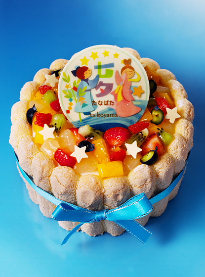 織姫と彦星が一年に一度だけ会える日、夜空の星に願い事をする・・・・・・。七夕というロマンチックな日には、大切な人たちと一緒にケーキを囲んで素敵なひとときを過ごしていただきたい、という思いを込めてデコレーションケーキを創り上げました。飾りにはきらびやかなフルーツたちを夜空に輝く星に見立ててデコレート。七夕にちなんで、マンゴー、あんず、苺、桃、キウイ、木苺、ブルーベリーという7種類のフルーツを使いました。ケーキは、ふんわりとして弾力のあるジェノワーズに、コクがありながらもあと口さっぱりのクレームシャンティと、桃のコンポートや苺をサンド。お口のなかで甘味や甘酸っぱさがバランスよく交わります。周りはふんわり軽いビスキュイ・アラキュイエールで囲んでやわらかな雰囲気のケーキに仕上げました。エスコヤマが得意とするチョコレート細工のプレートには織姫と彦星をデザイン。別添えの短冊には、お客様のリクエストに応じてメッセージを描かせていただきます。こちらのケーキを囲んで特別な一日をお過ごしください。