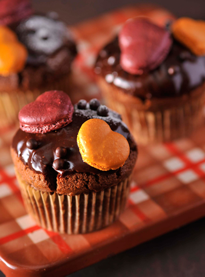 艶々のチョコレートにハートのマカロンが踊る、デコラティブなマフィン。ルックスはラブリーですが、しっとり上質な口当たり、ビター感際立つシックで奥深い味わいとのギャップに驚いていただけるはず。生地の中では、チョコレートを加えたクレームダマンドが濃厚なコクを、カシューナッツのキャラメリゼがサクサクの食感を、ブロックのミルクチョコレートが豊かな甘みをプラス。さらにトッピングのねっとりとしたグラサージュの下には、瑞々しく酸味ほとばしるアプリコットジャムを忍ばせて。その組み合わせはかの「ザッハトルテ」と同じく、甘み・苦味・酸味がベストなバランスで交じり合った重層的な味わいを醸します。大切な人やお友達への、バレンタインの贈り物にもふさわしい華やかな一品です。