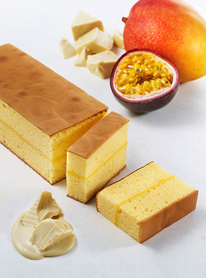 元々はそんなトリックをシンプルにお楽しみいただくためのお菓子でしたが、このたびの新作はちょっと違います。着地の味わいをイメージし、生地とガナッシュに分解。例えるならばボンボンショコラのように、口どけを経て完成する新感覚のバランスを導きました。ホワイトチョコレートとパッションフルーツの自家製クーベルチュールを練り込んだ生地に、サンドしたガナッシュはマンゴーの自家製クーベルチュールが主役。ただし生地にはマンゴー、ガナッシュにはパッションフルーツも少しずつ加えることで、より馴染みやすくなる仕掛けに。ふわふわしっとりとした軽さとは裏腹に、素材の味わいをしっかりと感じられる自家製クーベルチュールの可能性にもご注目。南国フルーツならではの香りと甘味、酸味がほどけて交わる、トロピカルで心地よいひとときをお楽しみください。