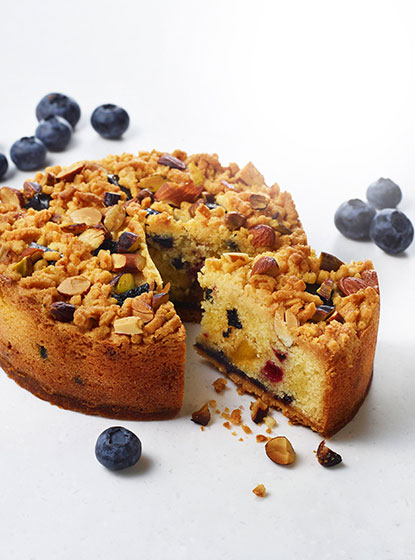 主役は夏のフルーツ「ブルーベリー」。バターの風味漂うパートシュクレに、シナモンをやさしく利かせたブルーベリーのコンフィチュール、ホワイトチョコレート入りのクレームダマンドを絞って。断面から覗いているのはワイルドブルーベリー。北米に自生する野生種で、小粒ながら甘酸っぱい果肉がぎゅっと詰まっています。さらに粉糖でマリネしたカシスを散らし、信州産ふじりんごのセミドライで食感に変化をもたらしました。仕上げにはブルーベリーの味わいを濃縮したパート・ド・フリュイで彩り、クランブルとアーモンド、ピスタチオでザクッとリズムを演出するとともに、タルトならではの芳ばしさとナッティな香りも添えて。