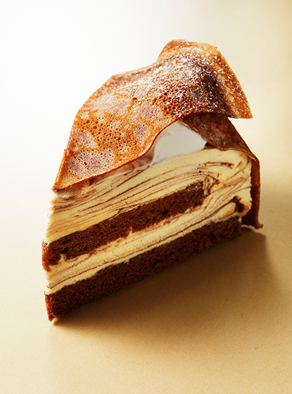 「気取らない、シンプルな商品も作りたかった」というこの一品は、オープン間際の一番最後にようやく完成した、小山シェフの自信作。ミルキーなホワイトチョコレートのババロアに、ビターチョコレートのガナッシュが絡み合い、ひと口ごとに変わってゆくショコラの風味が特徴です。さらにメレンゲを隠し味に使うことで、つるりんとしたババロアなのに、ふんわりとした食感が楽しめます。