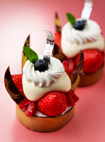 苺のタルトといえば、普通はクレームパティシエールがコンビネーションになるところを、クリームチーズを加えるところがエスコヤマ流。口に含んだ時に、あれっ?という意外性があるはずです。コクのあるクリームチーズとクレームパティシエールに、苺やフランボワーズの酸味が絡み合う深い味わいを、香ばしいタルトとともにお楽しみください。フランボワーズのコンフィチュールがよりいっそう苺の風味を引き立てます。