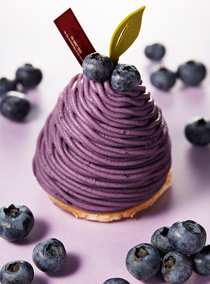 エスコヤマからほど近い丹波篠山にあるfutaba農園さんから届けていただいた、摘みたてのフレッシュな完熟ブルーベリーを使って、夏の彩りに新たな魅力を注ぎ込むプチガトーが誕生しました。一番の特徴は、何といってもその見た目。黄色いフルーツが主役を張っているエスコヤマのメインショップのショーケースの中で、色相環の中で黄色の反対色である、天然のアントシアニン由来の紫色をまとったモンブランが異彩を放ちます。実はシェフ小山も「この色を出すのが難しかった」と創作を振り返るほど。そんなモンブランの味わいは、クリームの中にすっぽり隠れた完熟ブルーベリーを周りのすべての要素が引き立てているイメージ。プチっと弾ける皮の張った果実から溢れるみずみずしさと自然な甘味。想像以上に爽やかなあと口は、この季節にふさわしい仕上がりです。ブルーベリーのモンブランクリームには、フランボワーズの華やかさと、ほんのすこ~しシナモンを加え、ボトムはダックワーズ、センターにはジューシーなブルーベリーのジュレとブルーベリーのフレッシュを潜ませて。たっぷり絞ったクレームシャンティは、コクと酸味をもたらすクリームチーズ+サワークリームを合わせてふくよかな味わいのクリームに仕立てました。飾りはブルーベリーの葉の色合いをまとったチョコレートとフレッシュなブルーベリーをあしらって。エスコヤマだからこそお届けできる、地元兵庫の旬をご堪能ください。