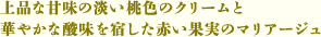淡~い桃色の特製白桃クリームに包まれたプチガトー「白桃のモンブラン」は、「この色こそ、本物のモンブラン(仏語でMont Blanc:白い山)じゃないか?」と思うような色合い。上品な甘味の中に、桃の華やかな香りと味わいを閉じ込めました。ボトムにはナッティなコクを感じるアーモンドのダックワーズ。その上には、赤い果実のジュレ、フランボワーズガナッシュ、白桃のコンポートを重ね、それらを白桃とアッサムティーが香るクレームシャンティで包み込みました。トップには、一目でわかる桃のフォルムにかたどった、フランボワーズの味わいを宿したチョコレートを。白桃、フランボワーズ、アーモンドなど、すべて同じ“バラ科”括りの素材が生み出す一体感を、たっぷりとお楽しみください。