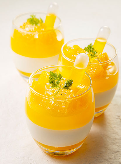 底にパッションフルーツとカルダモンのジュレを忍ばせ、ローストココナッツのブランマンジェ、オレンジジュレを重ねて、トップにはオレンジカルチェを。スポイトの中はサフランのシロップ。お好みで垂らしてお召し上がりください。