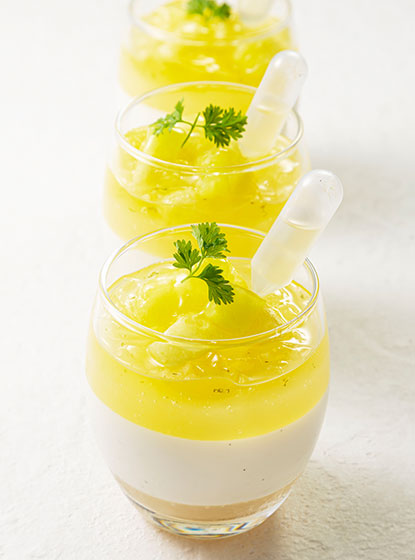 底にジャスミンティーとライチのジュレを忍ばせ、隠し味にサワークリームを用いたローストココナッツミルクのブランマンジェ、メロンジュレ、さらにライム香るレモンバーベナとスペアミントのジュレを重ねて。トップにはもちろんメロンの果肉。 スポイトの中のレモンバーベナとライムのシロップを垂らしていただけば、より爽やかな印象へと導きます。