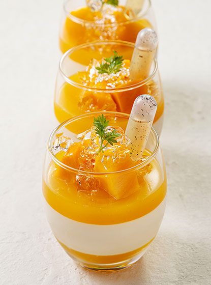 底にパッションフルーツとジャスミンティーのジュレを忍ばせ、トンカ豆とヘーゼルナッツのブランマンジェ、そしてマンゴーのジュレを重ねて。トップにはフレッシュの完熟マンゴーを飾り、ねっとりした食感とトロピカルで甘酸っぱい香りを加えました。スポイトの中はマダガスカル産バニラとラム酒の芳醇で甘い香りを閉じ込めたシロップ。お好みで垂らしてお召し上がりください。