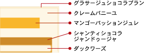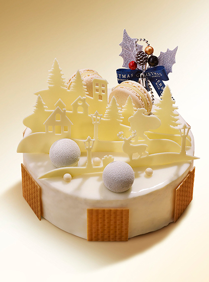 まるで雪が降り積もったかのような、白一色の世界。大阪・関西万博のイタリアパビリオンで目にしたペーパークラフトから着想を得て、サンタや家、街並みや木々をチョコレートで表現。飛び出す絵本のようなデザインに仕立てました。味わいの中心に据えたのは、マダガスカル産バニラの豊かな香りをまとったクリーム。底にアーモンドダックワーズ、ジャンドゥジャを使ったシャンティショコラを重ねることで、まったりとなめらかな口あたりを描きました。さらに、マンゴーとパッションフルーツを合わせたジュレのトロピカルな酸味がアクセントとなり、全体の輪郭を爽やかに引き締めます。飾りのマカロンもこのアントルメにふさわしく、真っ白な装い。マダガスカル産バニラのガナッシュに、マンゴーパッションのパート・ド・フリュイを忍ばせました。バニラ、マンゴー、パッションフルーツ、カカオ、ヘーゼルナッツといったシェフ小山が大好きな素材を散りばめたアントルメ。お子さまも大人の方も驚くデザインで、クリスマスに楽しい会話が弾みますように――そんな願いを込めて。