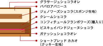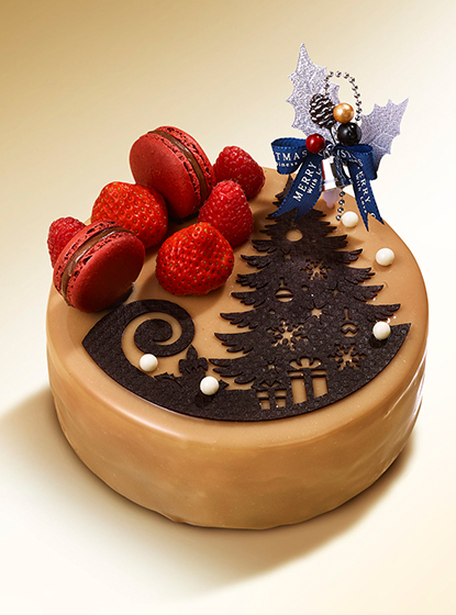 「バニラとチョコレートの組み合わせでとびきり美味しいケーキをつくりたい」というシェフ小山の発想から生まれたアントルメ。上の層はマダガスカル産バニラの芳醇な甘い香りをまとったババロア。 下層は同じくマダガスカル産のカカオから生まれたビターチョコレートで、カカオ感と赤いベリーのような酸味を表現したムース・オ・ショコラです。中には、コンフィチュールフランボワーズやフランボワーズの味わいを宿したビスキュイをサンド。ボトムはザクザク食感が楽しいショートブレッドカカオ(ノンエッグクッキー)を配し「もうひと口!」が止まらないバランスに。グラサージュはブロンドチョコレートとミルクチョコレートを合わせてライトな印象。ツリーの切り絵アート(ビターチョコレート)をダイナミックにデザインして、色合いのコントラストが目を惹くデザインに一新しました。