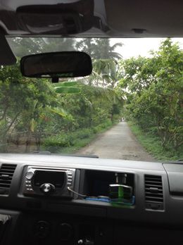 ホテルのロビーで挨拶をし、早速、用意してくれていた車に乗り込みます。カカオ農園まで車で約3時間。その前にカカオの発酵工場を見学するそうですが、その建物は元学校だと説明されました。