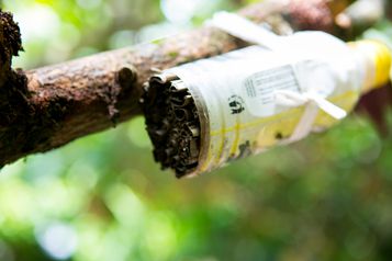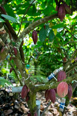 「さて、到着しました。」と車を降りると、カカオの農園です。昨年マダガスカルで見たカカオより少し樹齢の若い木がならんでいます。木の幹には沢山のカカオがくっつくように実が成っています。 「いつ見ても不思議な実のなり方をする植物だなあ」と眺めていると、枝にくっついているペットボトルに目が止まりました。ペットボトルの中身は木の皮の様なものが丸めて入っています。 「これはなんですか?」 と尋ねると、 「虫よけだ。この中には蟻が巣を作れるような仕組みになっていて、蟻がカカオにつく虫を退治してくれるんだよ。オーガニックなやり方です。」と教えてくれました。