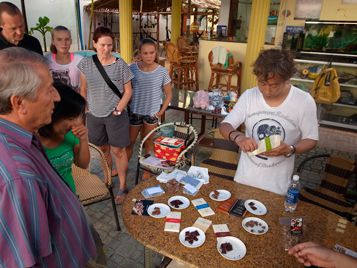 話は戻って、散策の後は、今日止まるホテルに移動して、戻って先ほど見たカカオから作られたチョコレートの試食会です。 ご夫婦がフランスからわざわざ運んできてくれたものですが、 「カカオ農園を見た後にこれを食べることが出来るのは、説得力があるよな」と小山シェフは興味深そうに机の上に並べられたいろいろなチョコレートを眺めています。 「ん、このミルクチョコレート面白い。酸味がいい感じや。マダガスカルのカカオも独特の酸味があるんだけど、それとはまた違う酸味や。」と頷きながら何かを考えてる様子。