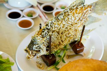 さて、今晩の食事は大きな池のほとりにあるレストラン。というかレストランの中に大きな池があって、その池の中の魚を使った料理を出してくれるレストランです。ベトナムにはこの手のレストランはそんなに珍しくないそうです。ちなみにこのレストランの池の中の水は濁っています。池の魚を食べ慣れていない日本人にとっては「この池の魚は大丈夫か?」と思わず不安になると思いますが、この国はメコン川もサイゴン川も大概濁っています。ホーチミン付近の川の水の透明度はほとんどありません。しかし、この水は汚い水が垂れ流しになって汚れているわけではなく、(いや、そうであってもだれも気が付かないともいますが・・・)川の水が赤茶色の川岸の土を浸食しながら流れていて、そのせいで水が赤茶色く濁っているそうだ。ちなみに、ここは沢山の生物が住んでおり、ベトナム人の食生活を支えているといっても過言ではない大事な川だそうです。