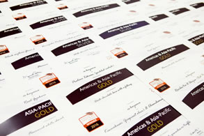 話は逸れましたが、続いて、ICAのペルーラウンドの表彰式になるはずが、初日の停電のせいで審査が遅れていたこともあり、それは後日行うとして、アメリカラウンドの表彰式が行われました。アメリカラウンドは小山シェフも参加しており、しかも、ほとんどの部門で賞を受賞しているので、表彰状や盾が多すぎて、全部の表彰はやめにして、ペルーのカカオを使ったチョコレートで受賞したものだけの表彰されることになりました。写真を見てもらえればわかると思いますが、Gold, Silver, Bronzeの表彰状を並べてみました。この量です。