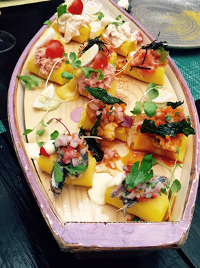 続いて出てきた料理は、一瞬お寿司と見間違えるようなスタイルの料理でした。カウサという、伝統的ペルー料理なのですが、カウサとは本来マッシュポテトにサラダを挟んだような料理ですが、ここで出されたのは小さく丸めたマッシュポテトの上にトリとマヨネーズ、マスとマスのソース、カニとエビ、アンチョビ、などが載せられていました。これがまたとても美味しいのですが、このビジュアルはお寿司からインスピレーションを得たものだと感じました。
