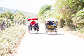 バイクは山道を走るようなオフロード仕様になっているようには見えないし、明らかにバイクの大きさの割に引っ張る座席が大きい。どう考えても引く力が足りていない感じがします。初めて見た時から、この楽しそうな乗り物には乗ってみたいと思っていましたが、できれば舗装された道が良かった、と思いながら、恐る恐る座席に乗り込み、いざ出発です。