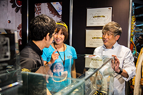 次に小山シェフが彼のショコラを食べる番です。先ほどよりも緊張した面持ちのビクトル。小山シェフは一つ一つゆっくり味見しながら、いろいろと彼に感想やアドバイスを述べてゆきました。話を聞くビクトルの真剣なまなざしは審査員の品評を聞いているような緊張感がありました。