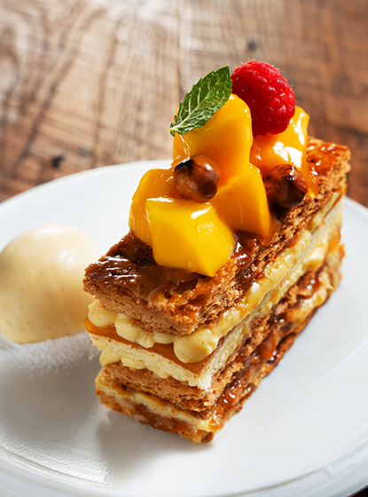 「マンゴー・マンゴー」と名乗るからには、ザクザクの歯触りが楽しいパイ生地の間にもちろんフレッシュなマンゴーがたんまり。コクのあるカスタードクリームとプラリネノワゼット、食感と味わいのバランスをとるビスキュイを1枚挟み込み、マンゴーの丸い甘みをぐっと引き立たせる酸味の効いたパッションのジュレをアクセントに加えました。